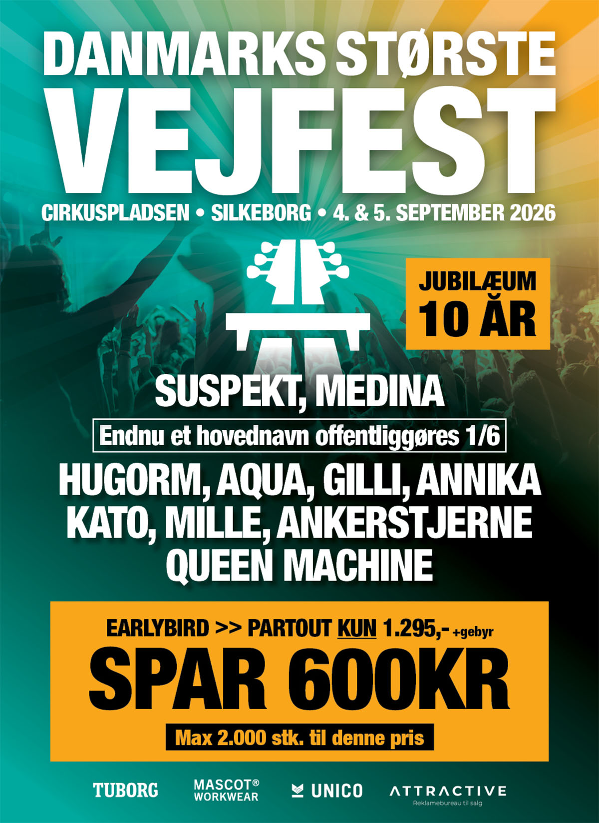 Tiden flyver og i 2026 er det 10 år siden vi afholdt Danmarks Største Vejfest for første gang. Det skal markeres, og for at fejre 10-års jubilæet har vi løftet musikbudgettet til et historisk niveau. Så glæd dig til "Vejfesten 2026" hvor du kan være med til at skrive endnu et kapitel i Silkeborgs største nyere festtradition, hvor vi endnu engang byder velkommen med flere af Danmarks mest populære artister på scenen.