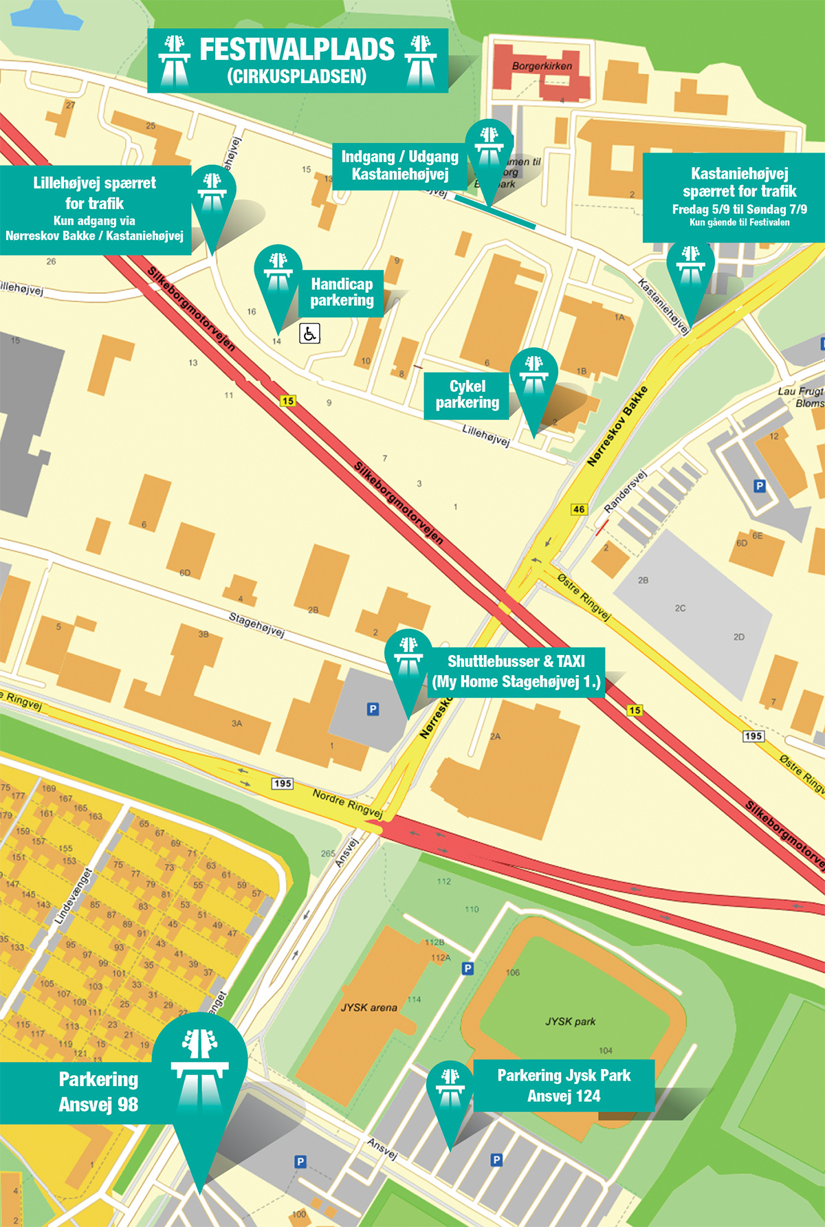 Bilparkering Der henvises til P-pladsen Ansvej 98, og Jysk Park, Ansvej 108 8600 Silkeborg, kun ca. 3 min. gang fra festivalpladsen.